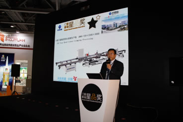 展會(huì)期間,在第二屆中國門窗幕墻年度星品評選中,天辰股份的數(shù)控四頭組角生產(chǎn)線以其填補(bǔ)國內(nèi)空白的先進(jìn)的技術(shù)及超高生產(chǎn)效率,獲得評審及專家的一致好評,勇奪“星品獎(jiǎng)”。天辰股份市場部傅旺經(jīng)理在星品發(fā)布會(huì)上對該設(shè)備進(jìn)行了詳盡的技術(shù)闡述。