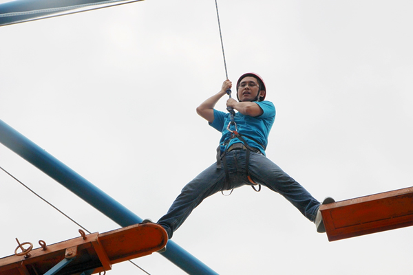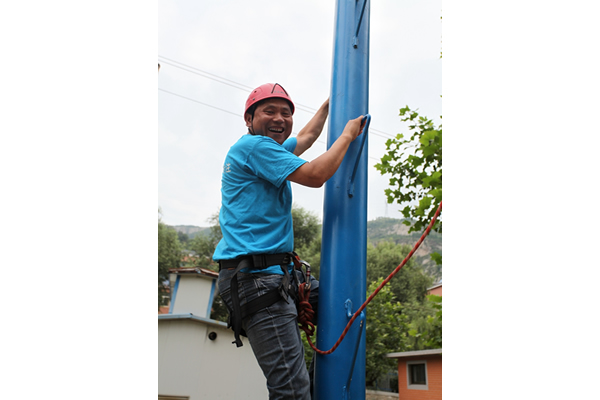 此次拓展訓(xùn)練加大了難度,增加了高空斷橋項(xiàng)目。挑戰(zhàn)人員需自行爬上八米的立柱,從很窄的木板上走過(guò),然后跨越到一米半以外的另一塊木板上,然后從兩塊木板中間跳下。雖然有保險(xiǎn)繩保護(hù),但對(duì)于參與者的心理和體力還是一個(gè)很大的挑戰(zhàn)。